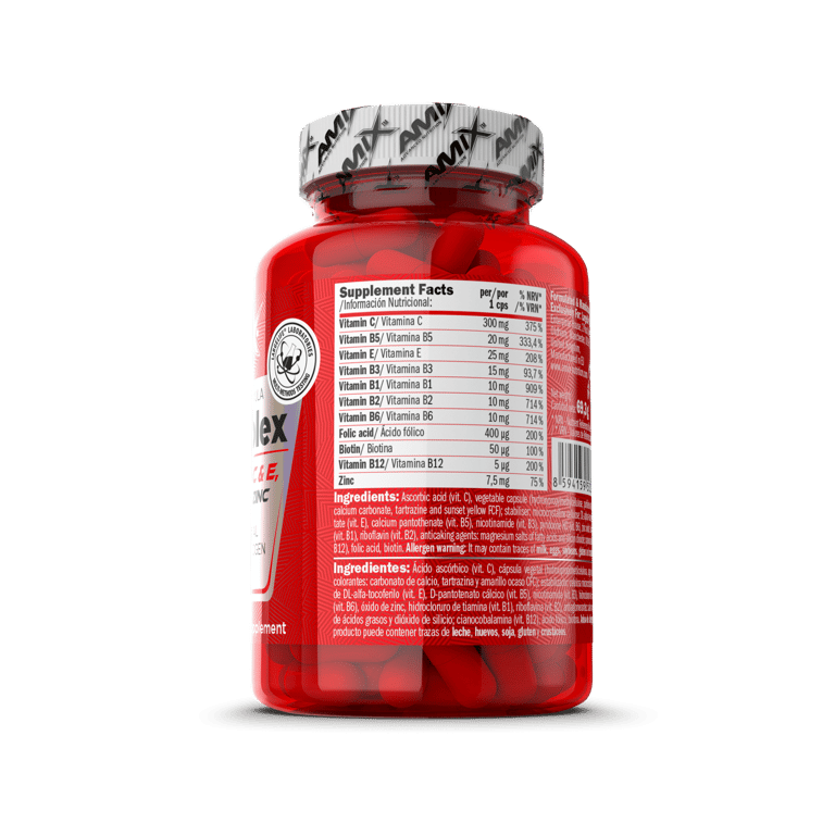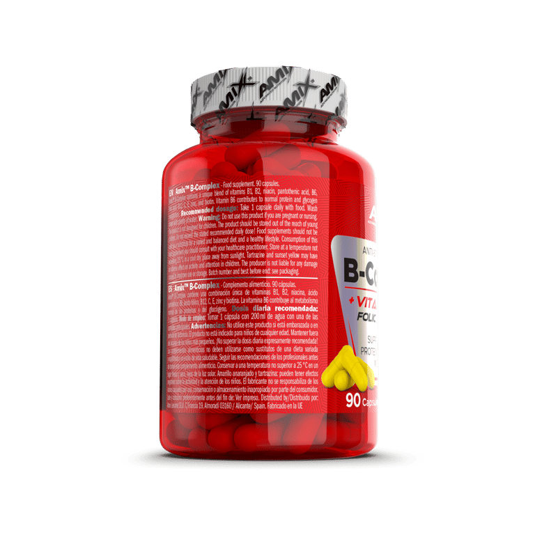 B-Complex d'AMIX NUTRITION contient un mélange unique de vitamines B1, B2, B3, B5, B6, B9 (acide folique), B12, de vitamines C et E et de calcium.