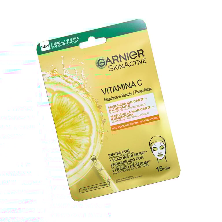 Gesichtsmaske aus Gewebe mit Vitamin C und Hyaluronsäure, die die Haut intensiv mit Feuchtigkeit versorgt.