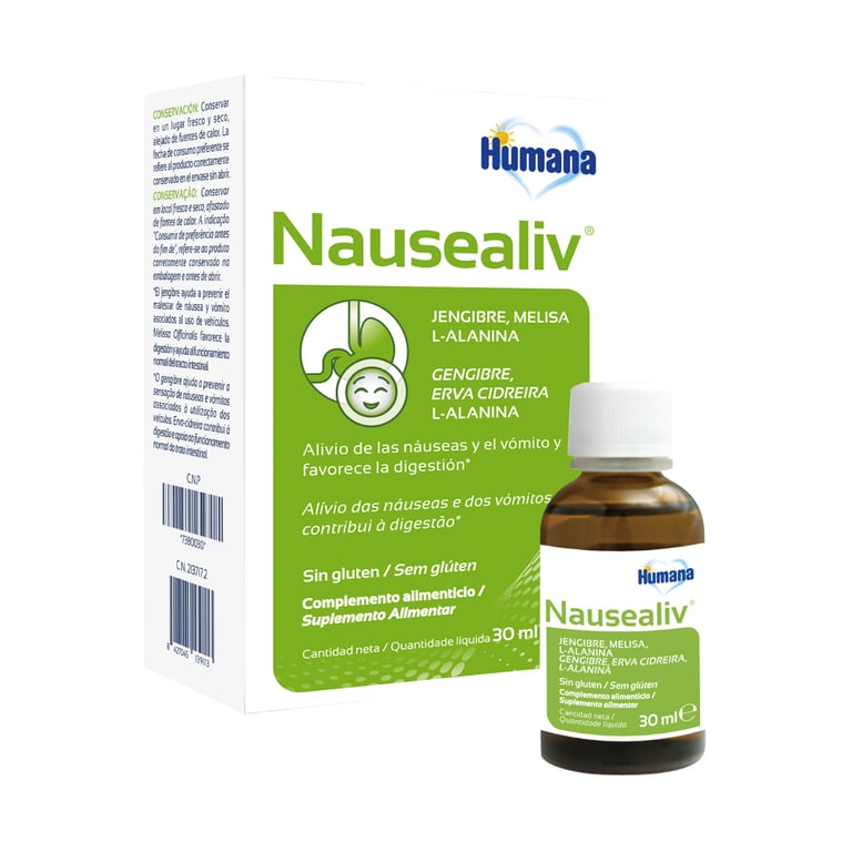Nausealiv auf Basis von Melisse, Vitamin B und Ingwer hilft sowohl bei Übelkeit als auch bei Erbrechen.