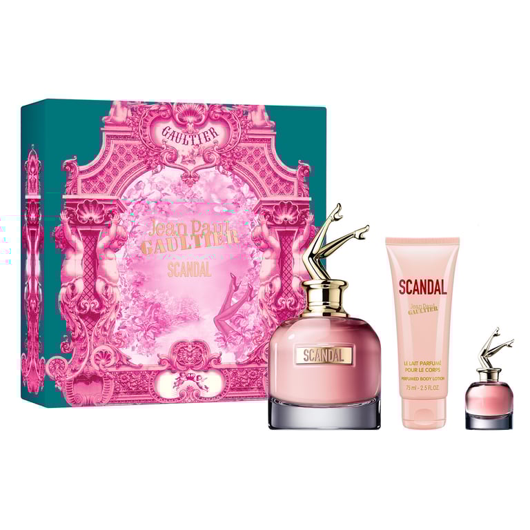 Scandal EDP 80 ml + Mini + Body Lotion 75 ml: ein sinnliches Paket mit Parfüm, Miniatur und Feuchtigkeitscreme.