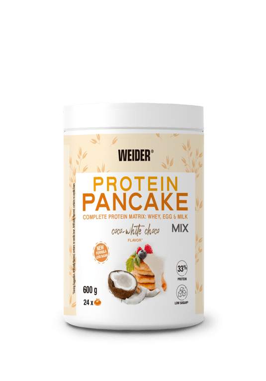 Protein Pancake Mix von Weider ist ein pulverförmiges Präparat zur Herstellung von Pfannkuchen auf Basis von Hafermehl und Proteinen (Molke, Milch und Ei).