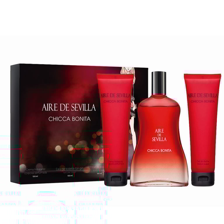 El pack ""Aire Sevilla Chicca Bonita EDT Set"" es una cuidada selección de productos de perfumería y cuidado corporal diseñada para quienes buscan una experiencia sensorial completa. Combina la frescura y elegancia de la fragancia con el cuidado e hidratación de la piel, ofreciendo un ritual diario de bienestar que envuelve los sentidos. Ideal como regalo o para disfrutar de un momento de lujo personal, este set destaca por su versatilidad y su toque sofisticado, convirtiendo la rutina en un verdadero placer aromático y sensorial.