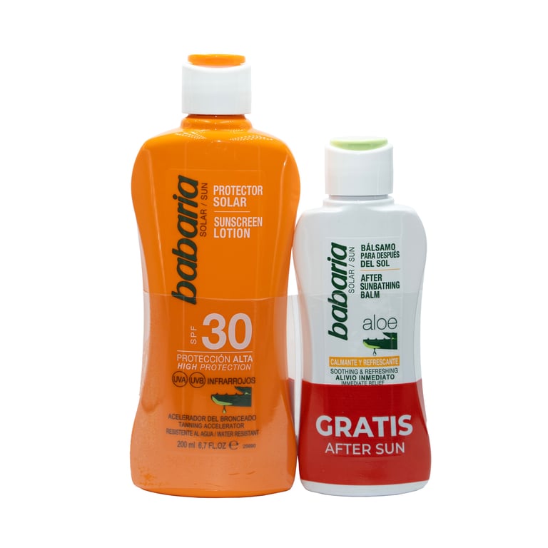 El pack Leche Protector Solar Aloe SPF30 200 ml + After Aloe de Babaria está diseñado para ofrecer una protección eficaz frente al sol mientras cuida y mantiene la piel hidratada. El protector solar SPF30 brinda una protección media, ideal para exposiciones solares moderadas, y su fórmula con aloe vera ayuda a mantener la piel hidratada y calmada. El after sun After Aloe complementa el cuidado, proporcionando alivio y frescura a la piel después de la exposición solar, reduciendo el enrojecimiento y la sensación de calor. Con este pack, tu piel estará protegida y cuidada durante todo el día.