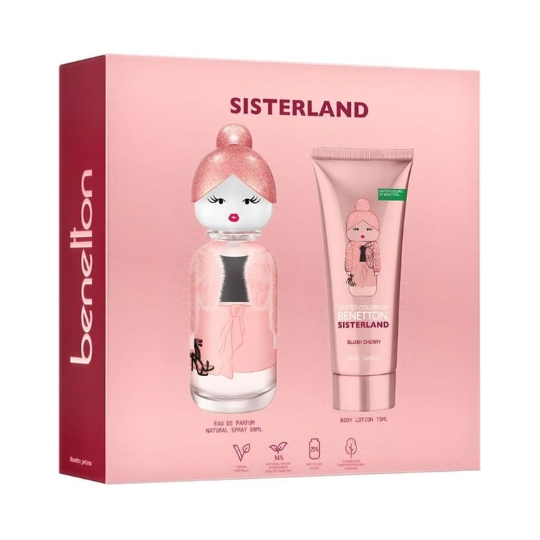 El Set Sisterland Blush Berry EDP de Benetton es un encantador pack de fragancia y cuidado corporal diseñado para mujeres que disfrutan de aromas dulces, vibrantes y llenos de energía. Inspirado en la amistad y la conexión entre mujeres, este set celebra la feminidad moderna con un perfume que combina notas frutales, florales y gourmand, ideal para el día a día. Su presentación cuidada lo convierte en un regalo perfecto o en una opción ideal para consentirte con un toque de frescura, dulzura y estilo característico de la colección Sisterland.