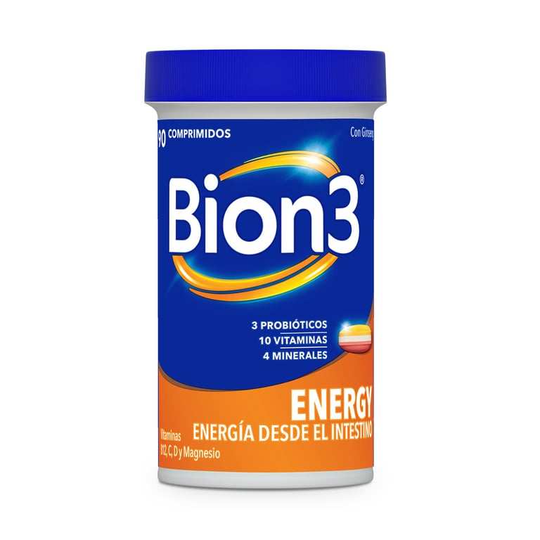 Bion3 Energy 90 Tabs es un multivitamínico de liberación prolongada diseñado para mantener tu energía física y mental. Su fórmula 3 en 1 combina probióticos, vitaminas del grupo B, vitamina C y magnesio, que apoyan el metabolismo energético y ayudan a reducir el cansancio.