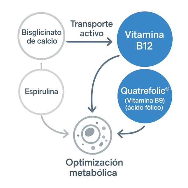 Vitamina B12, Vitamina B9 (ácido fólico), Bisglicinato de calcio, Espirulina