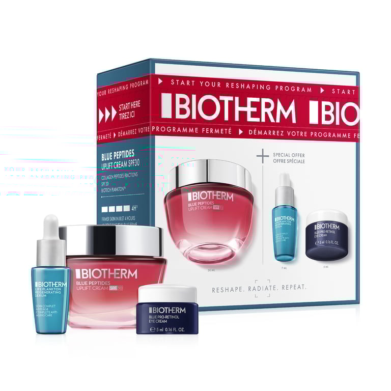 El Cofre Blue Peptides Uplift SPF30 de Biotherm es un set de cuidado facial diseñado para combatir los signos del envejecimiento, mejorar la firmeza de la piel y proporcionar una protección solar eficaz. Este pack combina tres productos esenciales que actúan de manera sinérgica para revitalizar, iluminar y reafirmar la piel, aportando un efecto lifting visible desde la primera aplicación. Ideal para todo tipo de pieles, especialmente aquellas que buscan un cuidado antiarrugas con protección diaria, dejando la piel suave, nutrida y radiante.