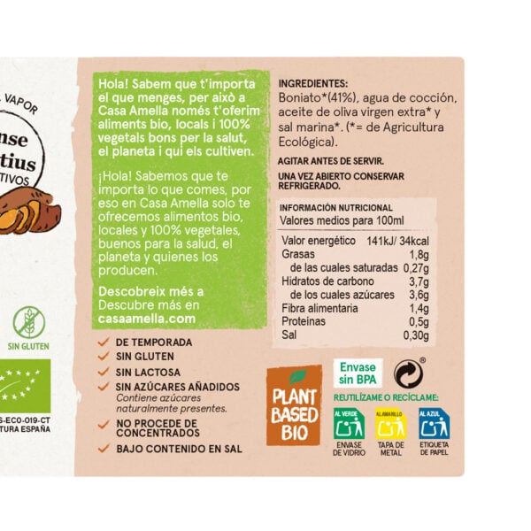 Boniato (41%), agua, aceite de oliva virgen extra y sal marina. ( = de Agricultura Ecológica)