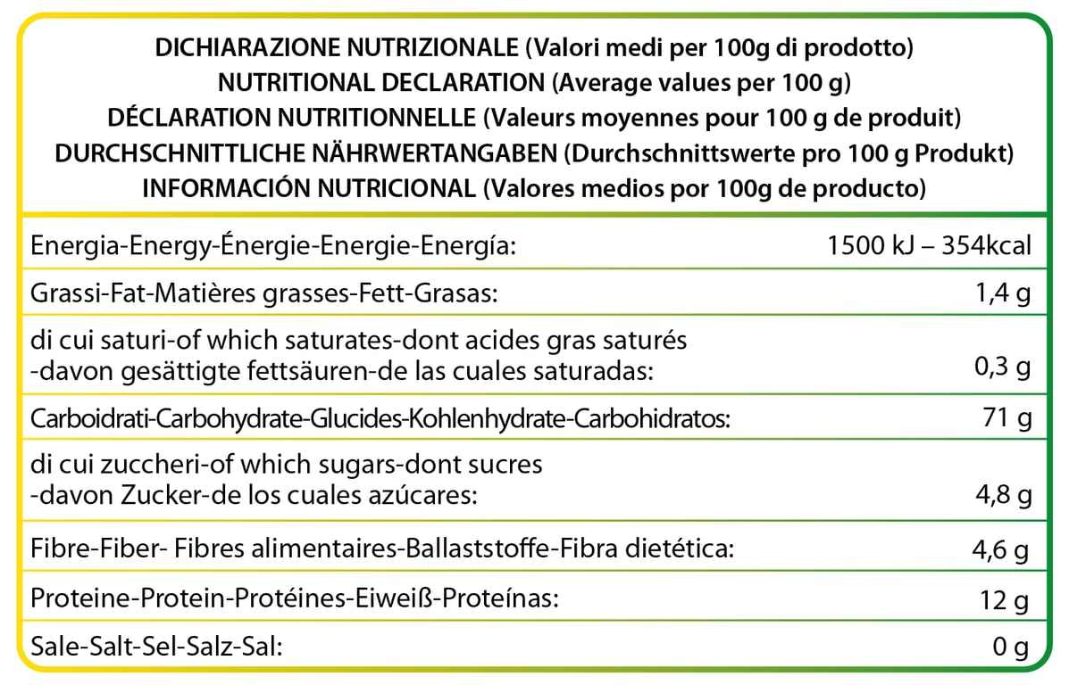 Sémola de trigo* duro, espinaca* deshidratada (3%) *Ingrediente biológico.