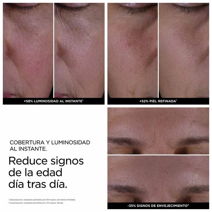 Su innovadora composición proporciona una cobertura instantánea y una luminosidad natural que transforma tu piel desde la primera aplicación. Pero esto es solo el comienzo: día tras día, esta extraordinaria base trabaja activamente para reducir los signos visibles del envejecimiento, mejorando notablemente la apariencia de tu piel.