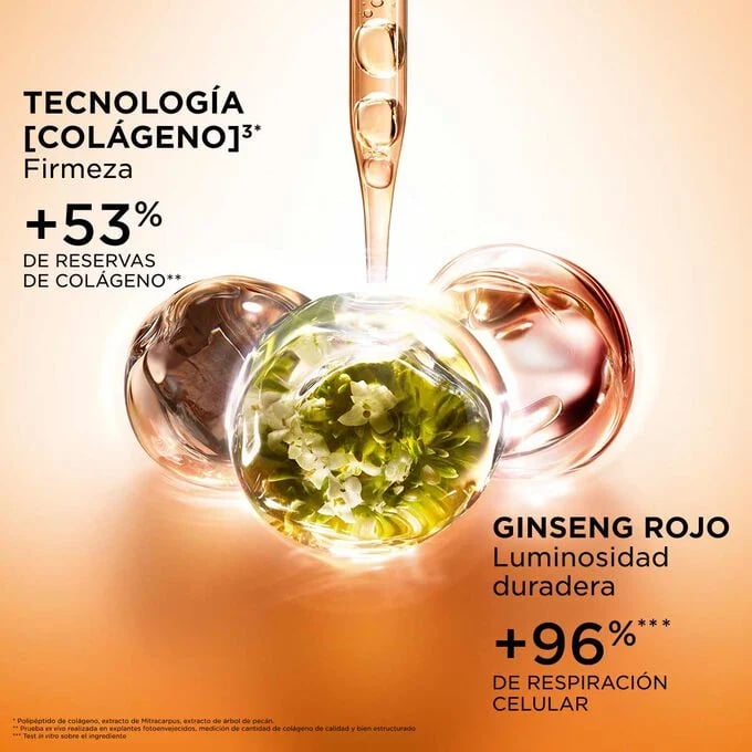 [{"name":"Ginseng rojo","percentage":"N/A","description":"Contribuye a aumentar las reservas de colágeno."},{"name":"Colágeno","percentage":"N/A","description":"Favorece la firmeza y elasticidad de la piel."},{"name":"Mitracarpus","percentage":"N/A","description":"Aporta luminosidad instantánea."}]