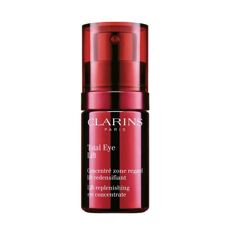 Total Eye Lift Concentre Zone Regard 15 ml de Clarins es un concentrado especialmente diseñado para redensificar y realzar la zona del contorno de los ojos. Su fórmula, enriquecida con un 94% de ingredientes de origen natural, incluye 2 poderoso extractos vegetales (Harungana Bio y Cera de Espinillo Blanco) para ayudar a tensar al instante los párpados, y alisar las arrugas y las líneas de expresión del contorno de ojos. Además, gracias a la Cafeína Vegetal, la Escina de Castaña de Indias y el extracto de Albizia la mirada luce descansada y el aspecto de las ojeras, las bolsas y las zonas oscuras se reducen.