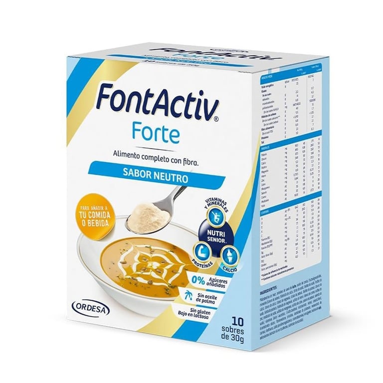 FontActive Forte Neutro es una complemento dietético completo en polvo con fibra, 13 vitaminas y 13 minerales. FontActive Forte Neutro aporta un perfil equilibrado de los macro y micronutrientes esenciales para la correcta salud. Todas sus presentaciones son sin gluten y sin lactosa, siendo aptas para intolerantes a la lactosa y celíacos.