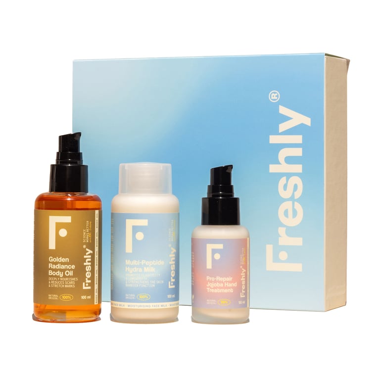 Deep Hydration Essentials de Freshly Cosmetics es un pack diseñado para cuidar y restaurar la hidratación natural de tu piel en rostro, cuerpo y manos. Ideal para mimarte a diario o regalar bienestar, combina texturas ligeras y fórmulas avanzadas con ingredientes de origen natural para aportar suavidad, nutrición profunda y confort duradero. Cada producto ha sido formulado con activos innovadores que trabajan en sinergia para mantener la piel protegida, calmada y visiblemente más saludable.
