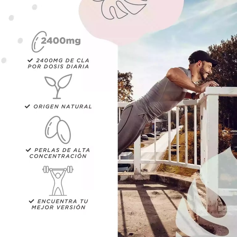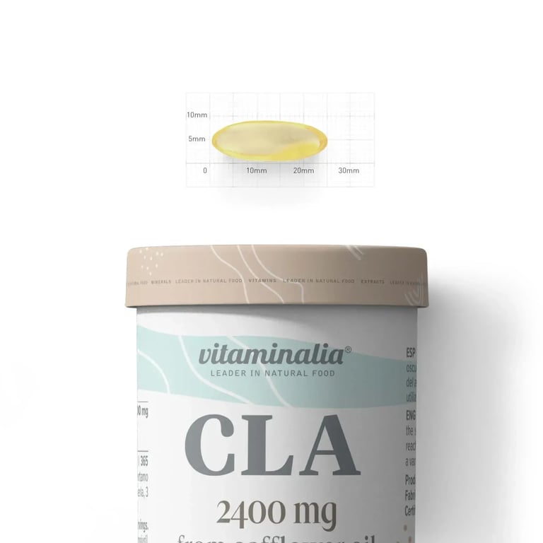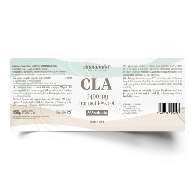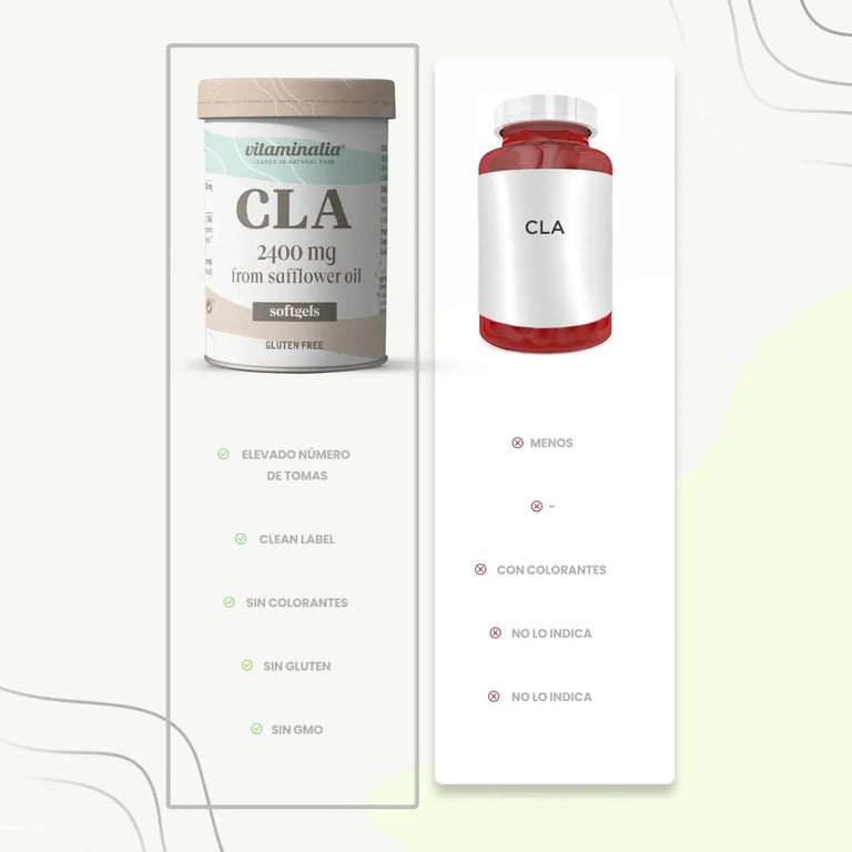 [{"name":"Ácido Linoleico Conjugado (CLA)","percentage":"2400mg","description":"CLA de aceite de semilla de cártamo (80% CLA)"},{"name":"Aceite de semilla de cártamo","percentage":"3000mg","description":"Base del CLA, mantiene una alta concentración."}]