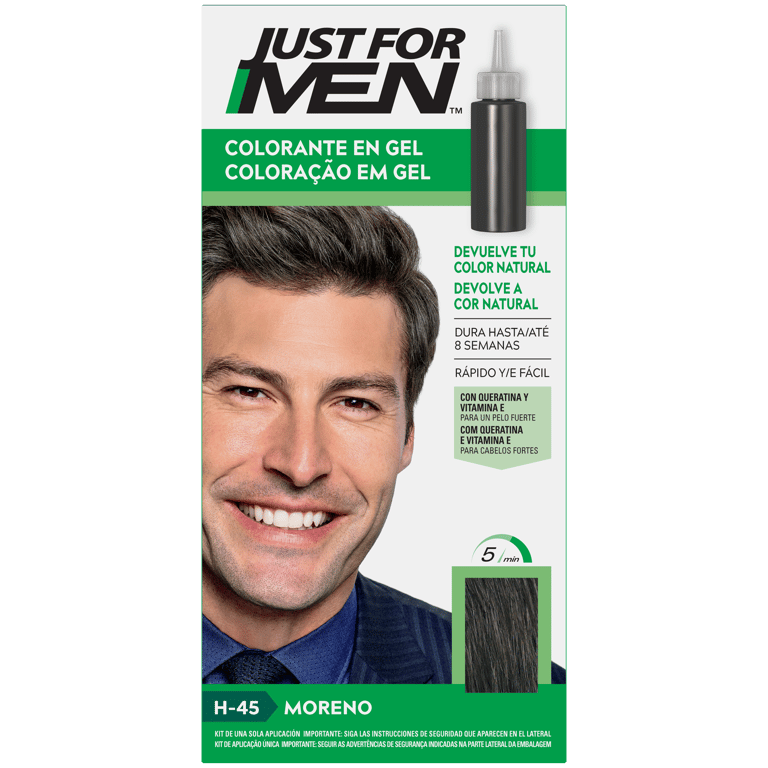Gracias a su cómodo formato en champú, Just For Men Colorante en Champú Moreno permite una fácil y rápida aplicación mientras te duchas, actuando en solo 5 minutos. Después de aclarar y secar tu pelo, difrutarás de un cabello suave, brillante y ¡sin canas!