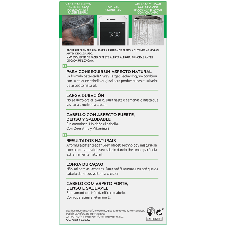 Gracias a su cómodo formato en champú, Just For Men Colorante en Champu Negro permite una fácil y rápida aplicación mientras te duchas, actuando en solo 5 minutos. Después de aclarar y secar tu pelo, difrutarás de un cabello suave, brillante y ¡sin canas!