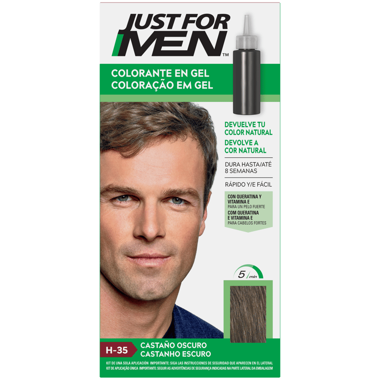 Gracias a su cómodo formato en champú, JJust For Men Colorante en Champu Castaño Oscuro H-35 permite una fácil y rápida aplicación mientras te duchas, actuando en solo 5 minutos. Después de aclarar y secar tu pelo, difrutarás de un cabello suave, brillante y ¡sin canas!