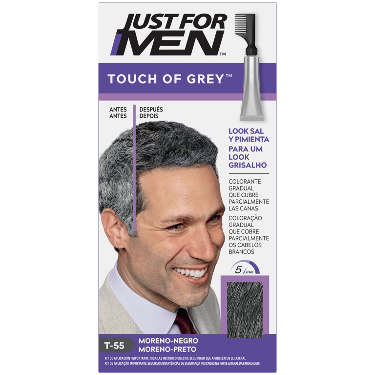 Just For Men Touch Of Grey Moreno actúa con el oxígeno del aire para eliminar solo algunas canas, respetando los matices naturales del color de tu pelo. Es muy fácil de aplicar, viene listo para usar y actúa en solo 5 minutos.