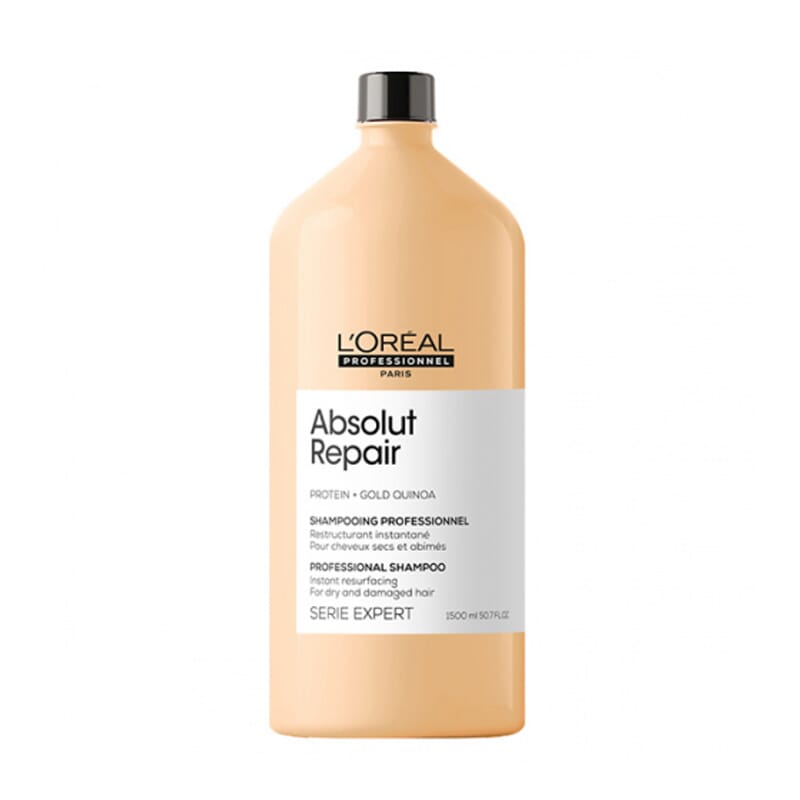 Absolut Repair Gold Quinoa + Protein Shampoo, de la marca de productos para el cabello L'Oreal Expert Professionnel, es un champú potenciado con proteína y quinoa dorada que limpia y reestructura el cabello más dañado al instante. ¡Repara el cabello sin apelmazar!