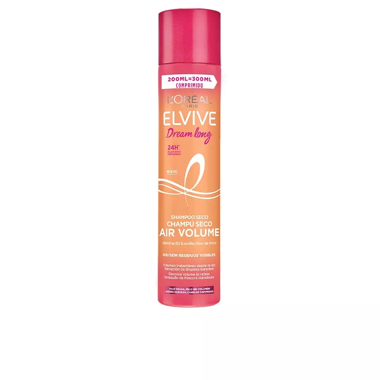 Elvive Dream Long Champú Seco Air Volume es la solución perfecta para quienes desean un cabello limpio y con volumen instantáneo sin necesidad de lavarlo. Este champú seco está formulado para ofrecer una sensación de frescura duradera, eliminando el exceso de grasa y dejando el cabello ligero y perfumado. Su innovadora fórmula, enriquecida con vitamina B3 y aceite de ricino, actúa desde la raíz para revitalizar el cabello y darle ese cuerpo deseado, sin dejar residuos visibles. Ideal para esos días en los que el tiempo es limitado, este champú seco se convierte en tu aliado para lucir un cabello saludable y con vida en cuestión de minutos.