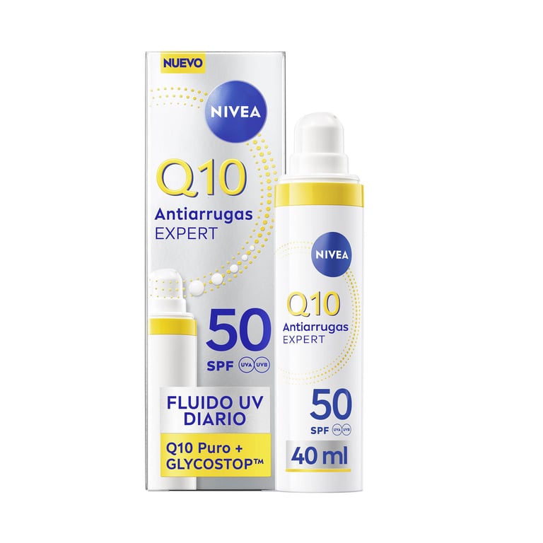 Nivea Visage Q10 Expert Fluido SPF50 40 ml es un tratamiento facial diario antiedad con alta protección solar, diseñado para combatir eficazmente los signos del envejecimiento causados por la exposición al sol. Enriquecido con el coenzima Q10 puro, este fluido ligero reduce visiblemente las arrugas, mejora la firmeza de la piel y protege contra la aparición de manchas solares. Su fórmula avanzada con FPS 50 protege contra los rayos UVA y UVB, ayudando a prevenir el envejecimiento prematuro inducido por el sol. Es ideal para pieles maduras que buscan un cuidado completo, combinando hidratación, protección y acción antiedad en un solo producto. Su textura ligera y de rápida absorción lo convierte en una opción perfecta para el uso diario, incluso bajo el maquillaje. Además, su fórmula dermatológicamente comprobada es compatible con todo tipo de pieles, incluidas las más sensibles. Con Nivea Q10 Expert, la piel se siente más firme, protegida y visiblemente rejuvenecida día tras día.