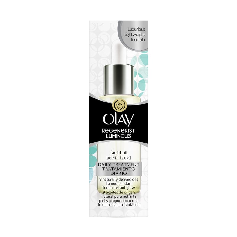 Aceite facial regenerist Luminous, enriquecido con 9 aceites naturales con propiedades antioxidantes, ideal para estimular la renovación del cutis y favorecer su óptima hidratación, elaborado por la marca Olay.