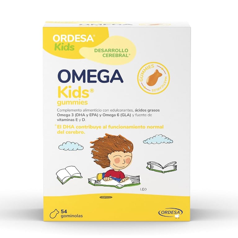 OmegaKids Gummies Masticables es un complemento alimenticio fuente natural de ácidos grasos Omega-3 (EPA y DHA) de origen marino y ácidos grasos Omega-6 (GLA) de origen vegetal, con un alto contenido de vitaminas D y E.