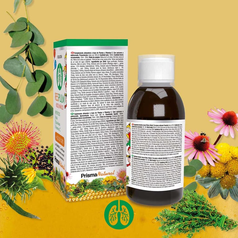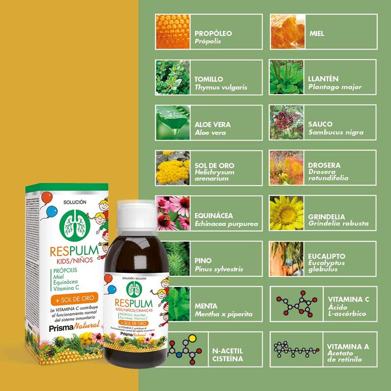FRUTOSA 7G, MIEL 500MG, MALVAVISCO (ALT HAEA OFFICINALIS L.) 100MG, SAUCO (SAMBUCUS NIGRA L.) 100MG, LLANTÉN (PLANTA GO MAJOR L.) 100MG, ALOE (ALOE VERA (L.) BURM. F.) 50MG, GRINDELIA (GRINDELIA ROBUSTA NUTT.) 50MG, TOMILLO (THYMUS VULGARIS L.) 50MG, DROSERA (DROSERA ROTUNDIFOLIA L.) 50MG, SOL DE ORO (HELICHRYSUM ARENARIUM (L.) MOENCH) 40MG, PROPÓLEO 40MG, EQUINÁCEA PURPÚREA (ECHINACEA PURPUREA (L.) MOENCH) 40MG, PINO (PINUS SYLVESTRIS L.) 7,32MG, EUCALIPTO (EXTRACTO SECO) (EUCALYPTUS GLOBULUS LABILL) 7,32MG, MENTA (MENTHA X PIPERITA L.) 4MG, EUCALIPTO (EXTRACTO FLUIDO) (EUCALYPTUS GLOBULUS LABILL) 4MG, VITAMINA A (RETINOL) 0,26MG (EQUIV. 78MCG DE RETINOL), DILUYENTES (AGUA Y GLICERINA VEGETAL), AROMA (AROMA DE FRESA), REGULADOR DE ACIDEZ (ÁCIDO CÍTRICO), CONSERVANTES (SORBATO DE POTASIO Y BENZOATO DE SODIO) Y EDULCORANTE (GLUCÓSIDOS DE STEVIOL).