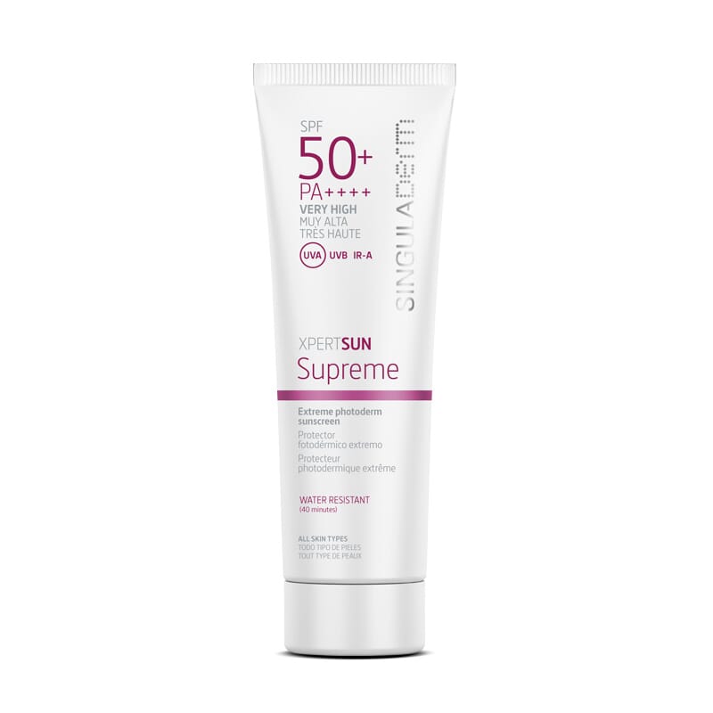 Xpertsun Supreme SPF50+ de Singuladerm es una crema ultraligera que transforma las propiedades naturales de la piel, en un verdadero escudo fotoprotector de amplio espectro (UVA/UVB/IR). Su innovadora fórmula, protege la piel del rostro y el cuerpo de los dañinos rayos solares, contribuye a reparar las fotolesiones ya existentes y preserva la integridad de las células durante la exposición solar.