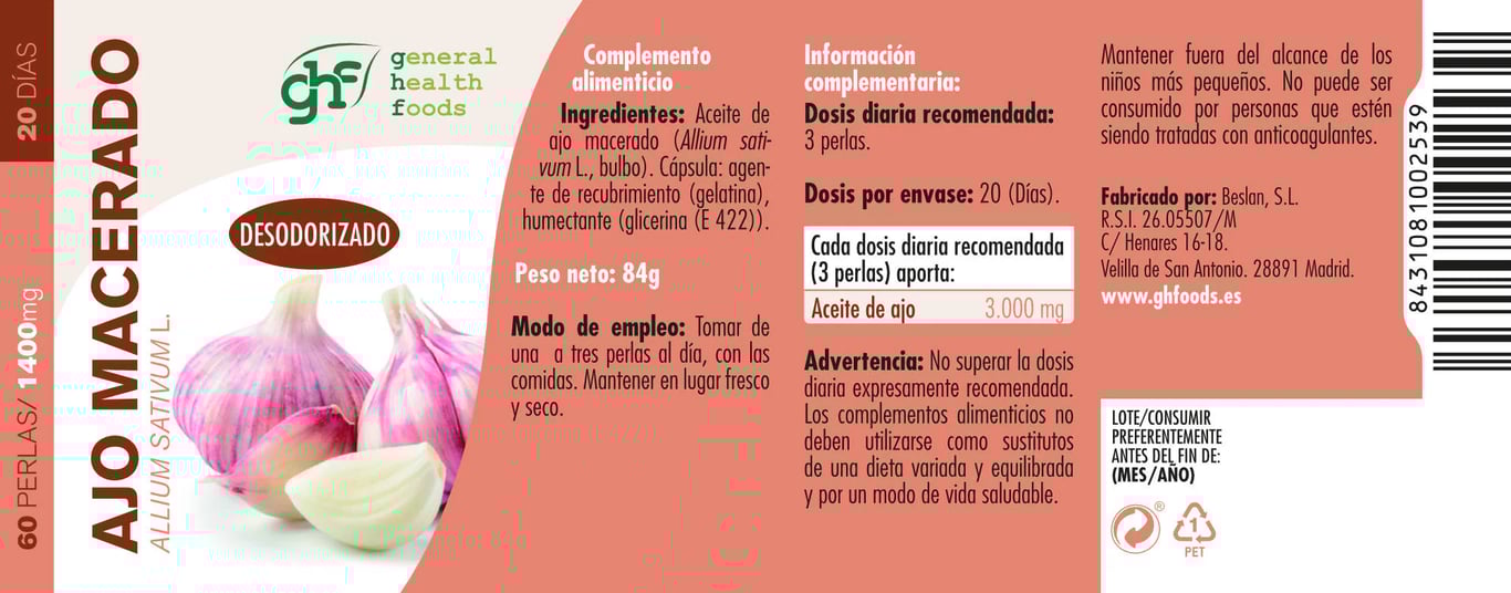 El Ajo Macerado de GH Foods en prácticas perlas de 1400mg te ofrece todos los beneficios del ajo tradicional sin las molestias del sabor y olor característicos. Gracias a su proceso de desodorización, podrás aprovechar al máximo las propiedades naturales de este superalimento.