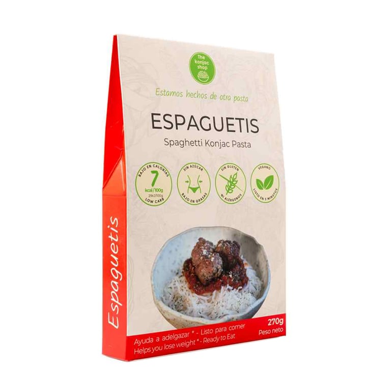 Espaguetis a base de konjac shirataki de la marca The Konjac Shop®, de exquisito sabor y textura parecida a la pasta tradicional, que permite realizar comidas saludables gracias a su bajo contenido en carbohidratos.