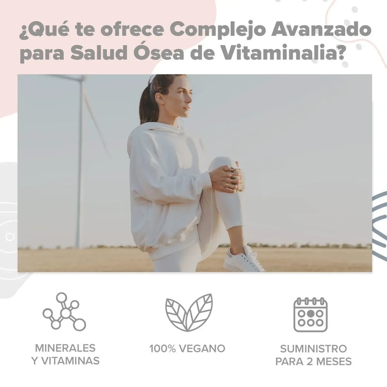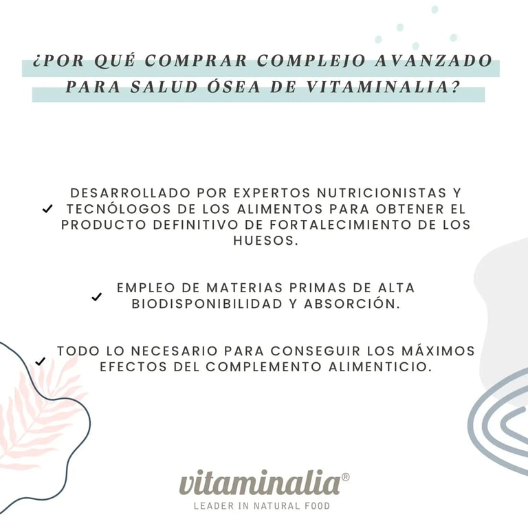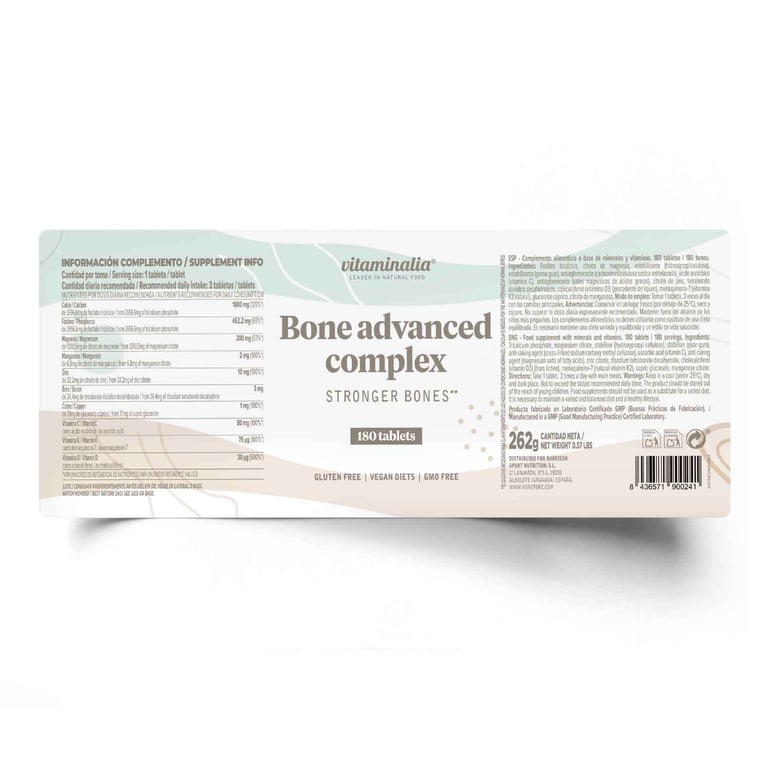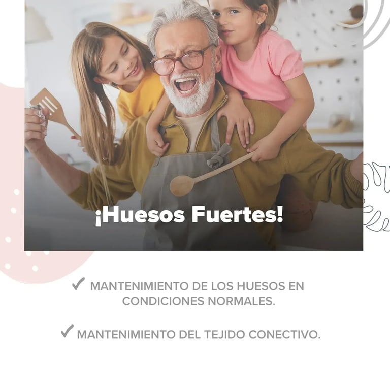 [{"name":"Calcio","percentage":"1000mg","description":"El calcio es necesario para el mantenimiento de los huesos."},{"name":"Fósforo","percentage":"452,2mg","description":"Contribuye al mantenimiento de los huesos."},{"name":"Magnesio","percentage":"200mg","description":"Contribuye al mantenimiento de los huesos."},{"name":"Manganeso","percentage":"2mg","description":"Contribuye al mantenimiento de los huesos."},{"name":"Zinc","percentage":"10mg","description":"Contribuye a la síntesis proteínica normal."},{"name":"Boro","percentage":"3mg","description":"Elemento traza característico por estar poco presente en alimentos."},{"name":"Cobre","percentage":"1mg","description":"Contribuye al mantenimiento del tejido conectivo."},{"name":"Vitamina C","percentage":"80mg","description":"Contribuye a la formación normal de colágeno."},{"name":"Vitamina K","percentage":"75μg","description":"Contribuye al mantenimiento de los huesos."},{"name":"Vitamina D","percentage":"30μg","description":"Contribuye a la absorción normal del calcio."}]