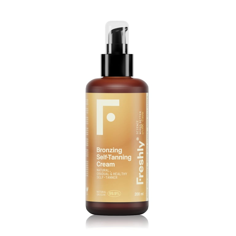 La Bronzing Radiance Self-Tanning Cream de Freshly Cosmetics est une crème autobronzante de haute qualité qui procure un bronzage naturel et uniforme sans exposition au soleil. Grâce à sa formule composée à 99% d'ingrédients naturels, cette crème s'adapte à tous les types de peau, offrant un effet progressif qui se renforce à partir du troisième jour. Son action repose sur une combinaison de bioactifs végétaux tels que le DHA et le complexe Erythrulose, qui agissent pour obtenir un teint doré sans taches ni sensation grasse. Elle est idéale pour ceux qui recherchent un bronzage sain et durable, sans les effets néfastes du soleil. De plus, sa formule non seulement autobronze, mais prolonge également le bronzage naturel après l'exposition au soleil, aidant à maintenir un teint radieux plus longtemps.