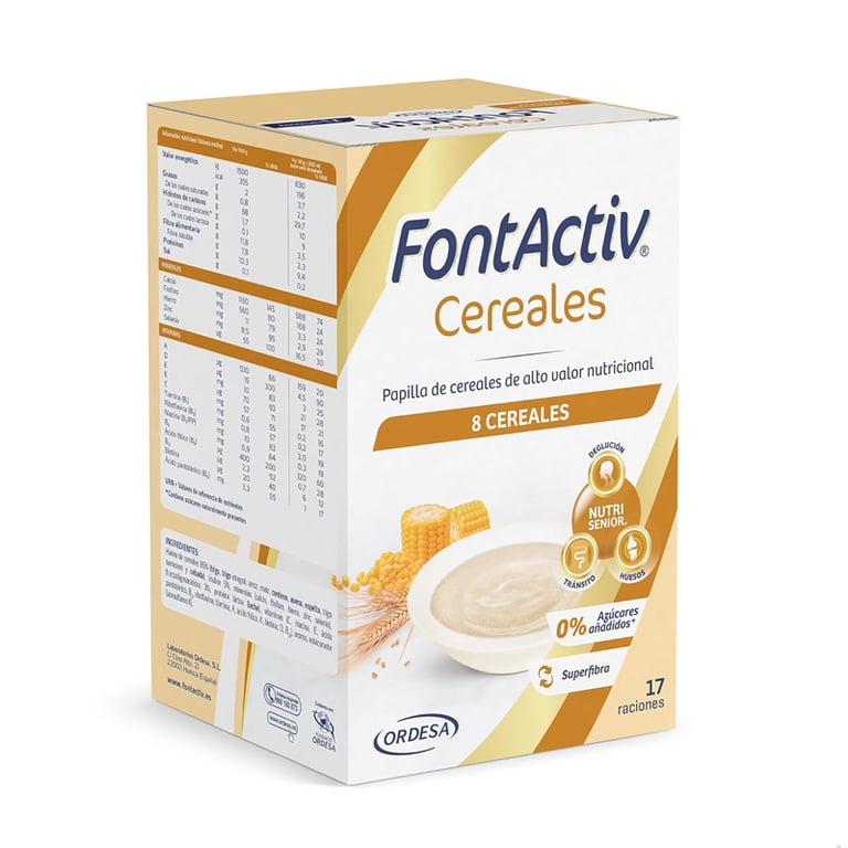 Miscela di 8 cereali senza zuccheri aggiunti, che si adatta alle esigenze degli adulti e delle persone anziane.