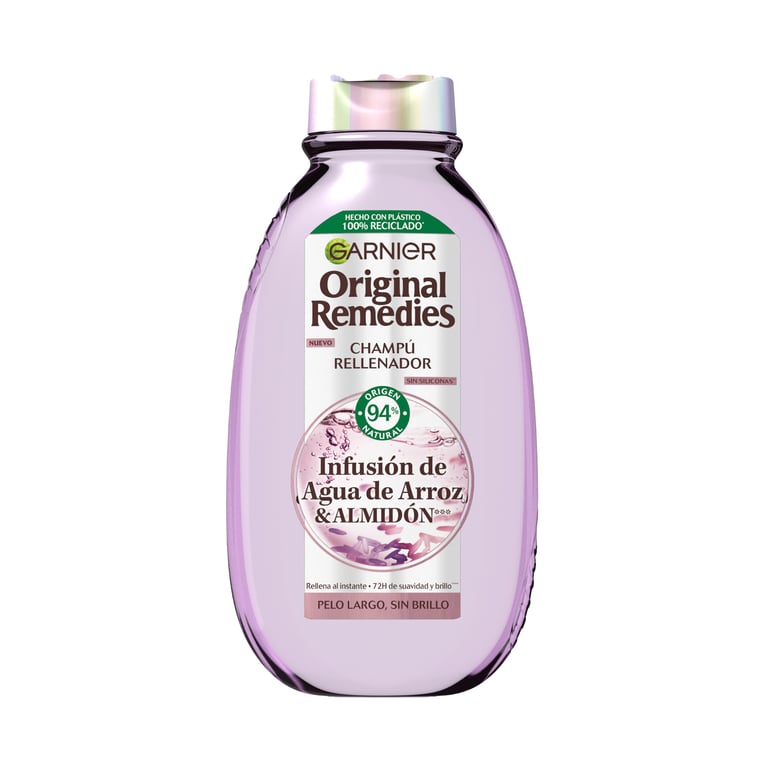 Shampoo fortificante con acqua di riso e amido che riempie e rivitalizza i capelli, dando volume e leggerezza senza residui.