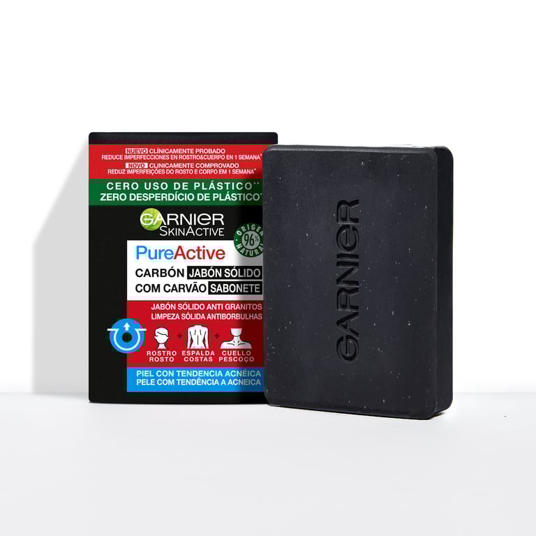 Jabon solido anti-brufoli che contiene carbone e acido salicilico che forniscono una pulizia e un'esfoliazione profonda della pelle.
