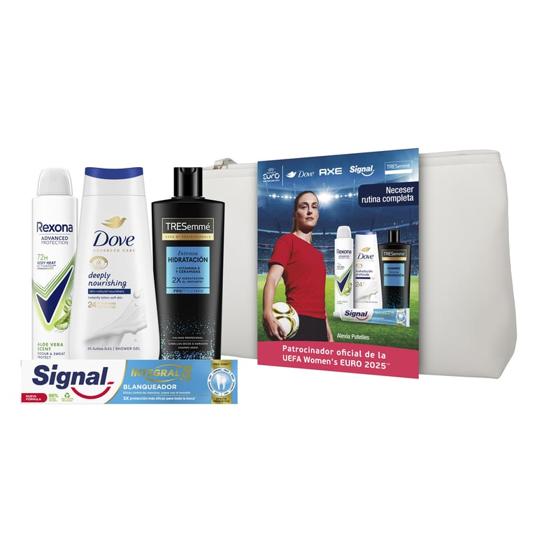 Pack UEFA Alexia con 4 prodotti essenziali: Rexona, Dove, Tresemmé e Signal per una routine completa.