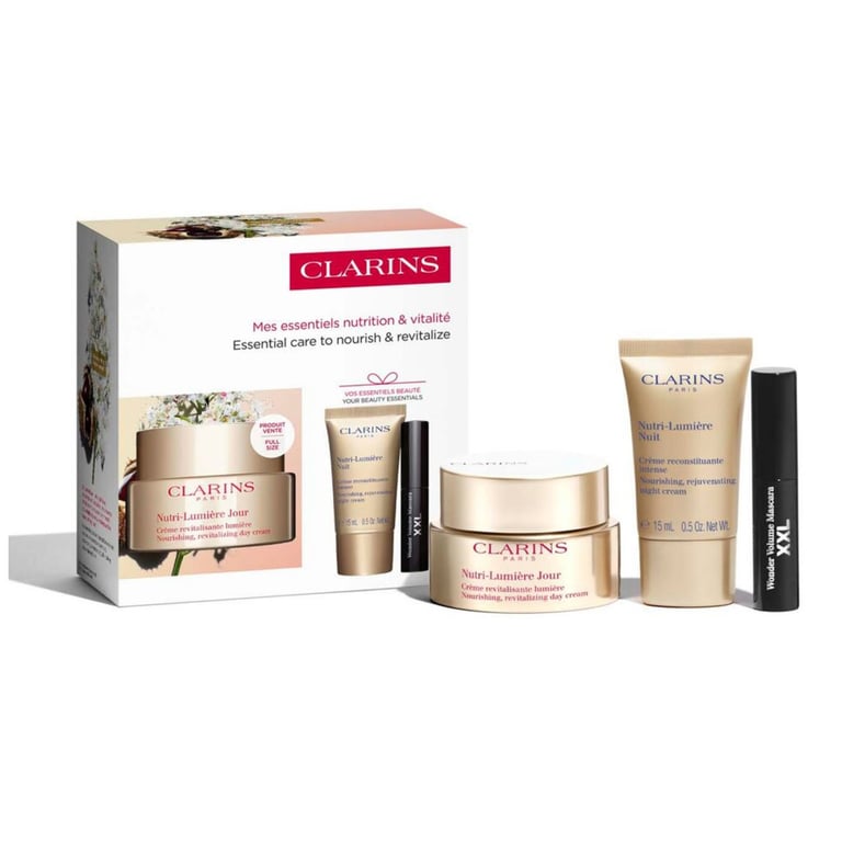 Nutri-Lumière Jour Lote 3 Piezas van Clarins is een exclusieve gezichtsbehandelingsset ontworpen om de rijpe huid te revitaliseren en te voeden, waardoor haar helderheid en vitaliteit worden hersteld. Deze set combineert de intense hydratatie van Nutri-Lumière Jour met de nachtelijke herstelactie van Nutri-Lumière Nuit, aangevuld met de Mini Wonder Volume Máscara XXL om de natuurlijke schoonheid van je blik te versterken. Het is de perfecte bondgenoot voor wie een stralende en verjongde huid wil, dag na dag.
