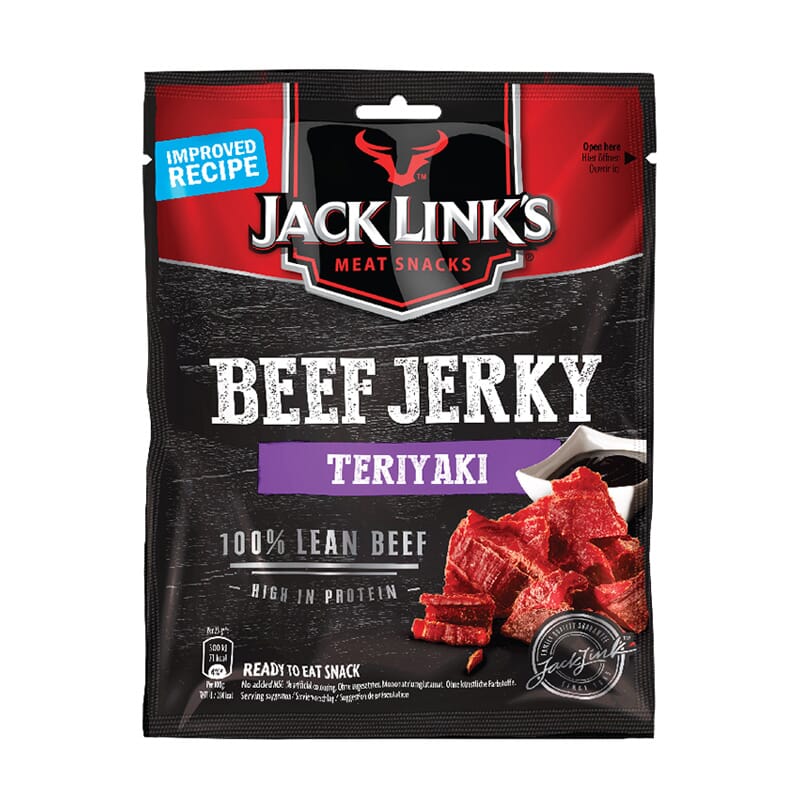 De Beef Jerky Teriyaki van Jack Links is een snack om te nemen wanneer je maar wilt. Het betreft fijn en knapperig gesneden vlees, met een hoog energieniveau en eiwitgehalte. Na het selecteren van vlees van de beste kwaliteit, wordt het gedroogd en gekruid met een traditioneel recept. Ideaal voor de perfecte snack wanneer je aan het sporten bent!