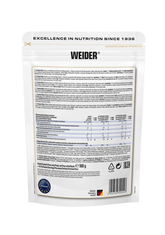 Premium Whey van Weider is een product dat eiwitten van wei van hoge kwaliteit combineert. 60% is wei‑concentraat verkregen door ultrafiltratie, verrijkt met 20% isolaat om de eiwitinhoud te verhogen. De grondstoffen van Premium Whey worden verkregen door ultrafiltratie, een proces bij lage temperatuur en lage druk dat de wei‑eiwitten ongedenatureerd houdt. Premium Whey is aangevuld met 2 g L‑glutamine en is volledig vrij van aspartaam.
