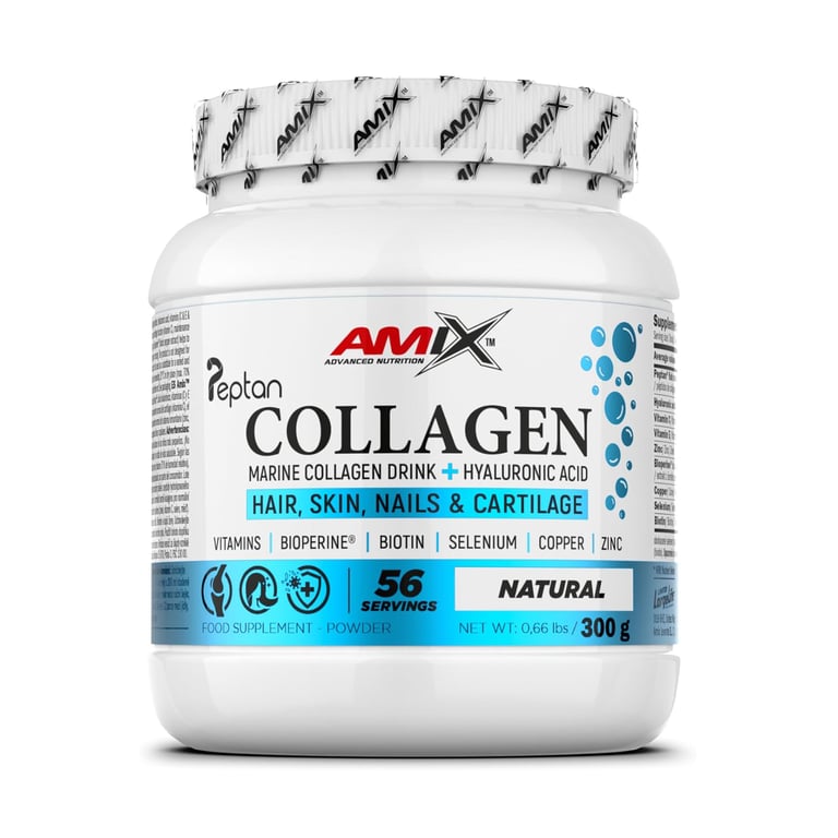 Suplemento em pó com colágeno hidrolisado Peptan®, ácido hialurónico, vitaminas, minerais e Bioperine®, projetado para apoiar a pele, ossos e articulações.