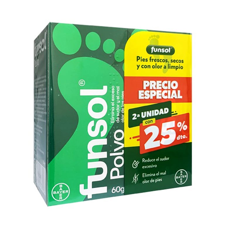 Funsol Polvo é um desodorizante em pó formulado especificamente para manter os pés frescos, secos e livres de mau odor. A sua fórmula inovadora combina óxido de zinco, talco, amido de milho e Aerosil®, ingredientes que atuam eliminando o excesso de suor sem dificultar a transpiração natural. Ao neutralizar a humidade e criar um ambiente hostil para os microrganismos, ajuda a prevenir o mau odor de forma eficaz e prolongada.
