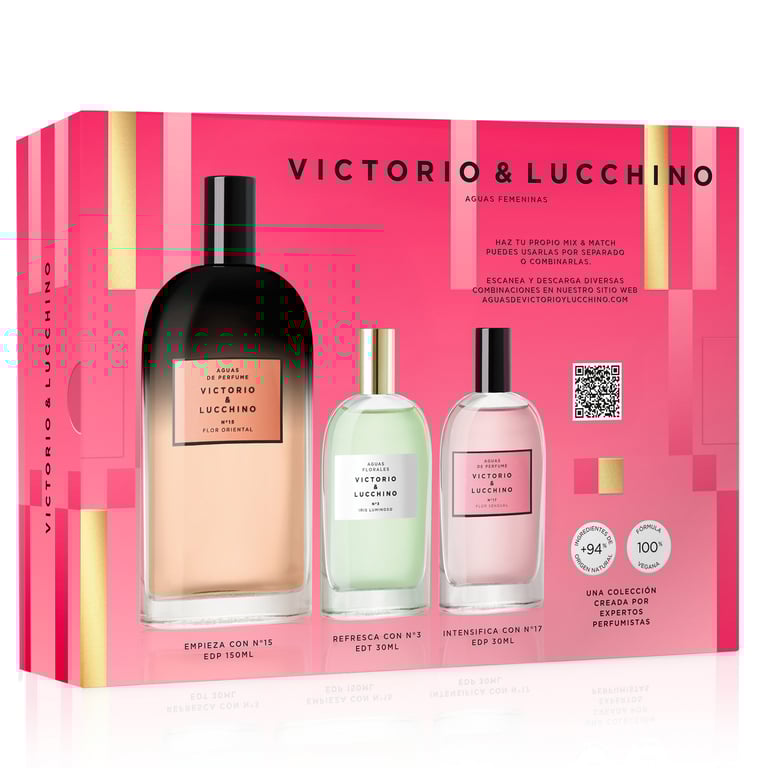 O pack "Set Aguas Florais EDT Nº3" da Victorio & Lucchino é uma combinação elegante e sofisticada de fragrâncias que convida a uma experiência sensorial completa. Desenhado para quem procura harmonia e frescura no seu dia a dia, este conjunto oferece perfumes complementares que se destacam pela sua personalidade floral e moderna, ideais para qualquer ocasião. Cada aroma foi cuidadosamente elaborado para proporcionar uma estela duradoura e delicada, deixando uma impressão inesquecível e refinada.