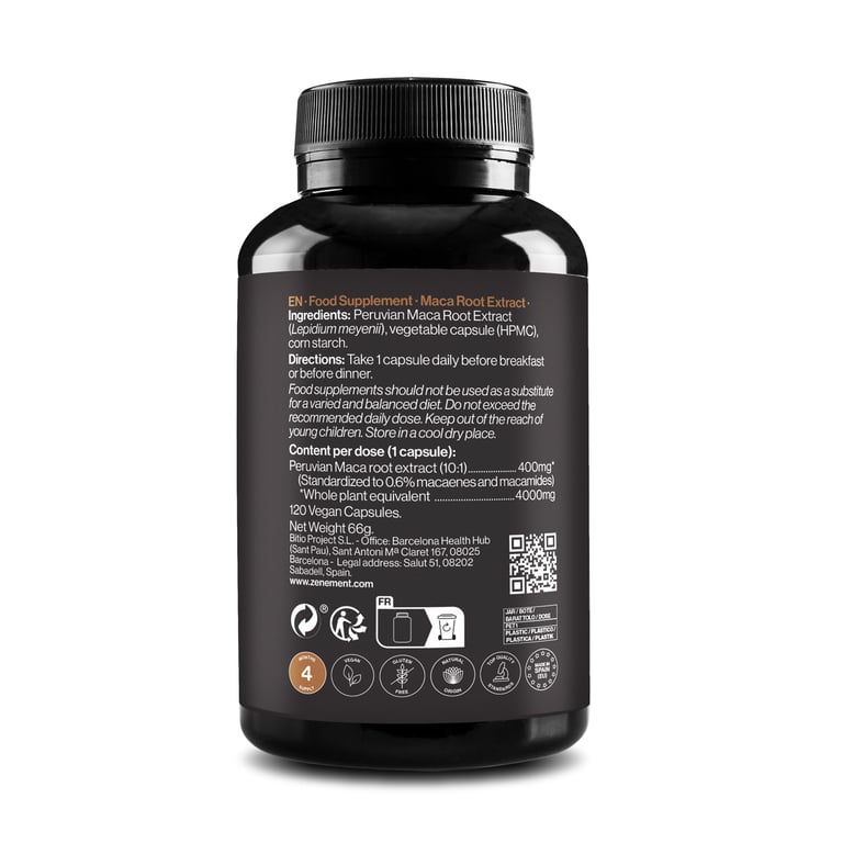 - 400 mg de extrato de raiz de maca (10:1) por dose (1 cápsula).